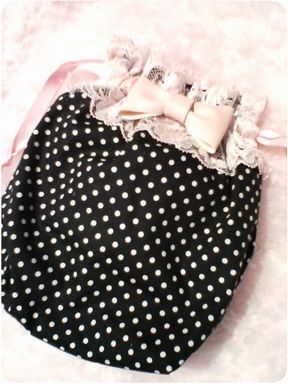 黒地に白ドット、ピンクのレースが可愛い巾着ポーチ