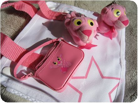 ピンクパンサーは手前から、アクセサリーポーチ・携帯クリーナー・キーホルダーの三つ
