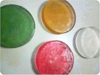なかなかカラフル〜な石鹸。左からオイリー肌(緑)、混合肌(茶色)、乾燥肌(赤)、敏感肌(透明)用となっています