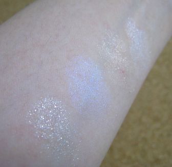 大粒のシルバーラメにアイシーブルー、ブラウンゴールド、ホワイトシルバーの粒子の細かいアイシャドウの組み合わせ