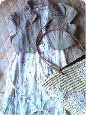 ショート丈のデニム地ボレロと花柄シャツワンピとカゴバッグ