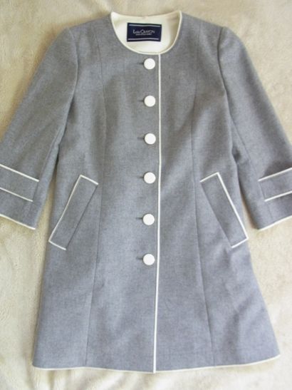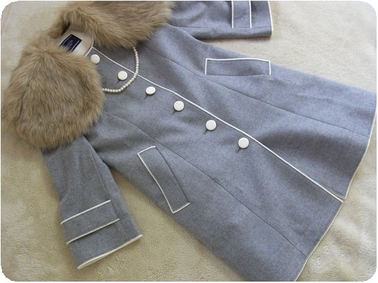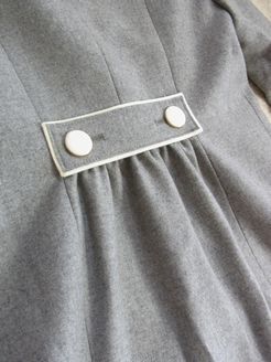 ライトグレーに白のパイピングと白ボタンがお嬢っぽいノーカラーコート