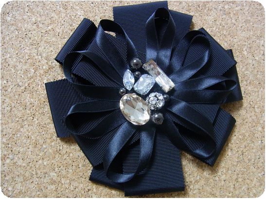 リボンをまとめて花にしたようなデザインで、真ん中に形や色の違うストーンが留められています