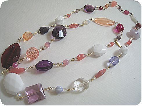 パープル系、ホワイトを中心に天然石やガラスビーズが繋ぎ合わさったロングネックレス