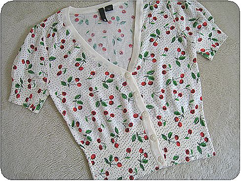 アイボリーっぽい白地にドットとチェリーが描かれたカーディガン