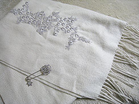 フリーストアの刺繍マフラーで、バラに雪の結晶のモチーフが付いたピンも付属
